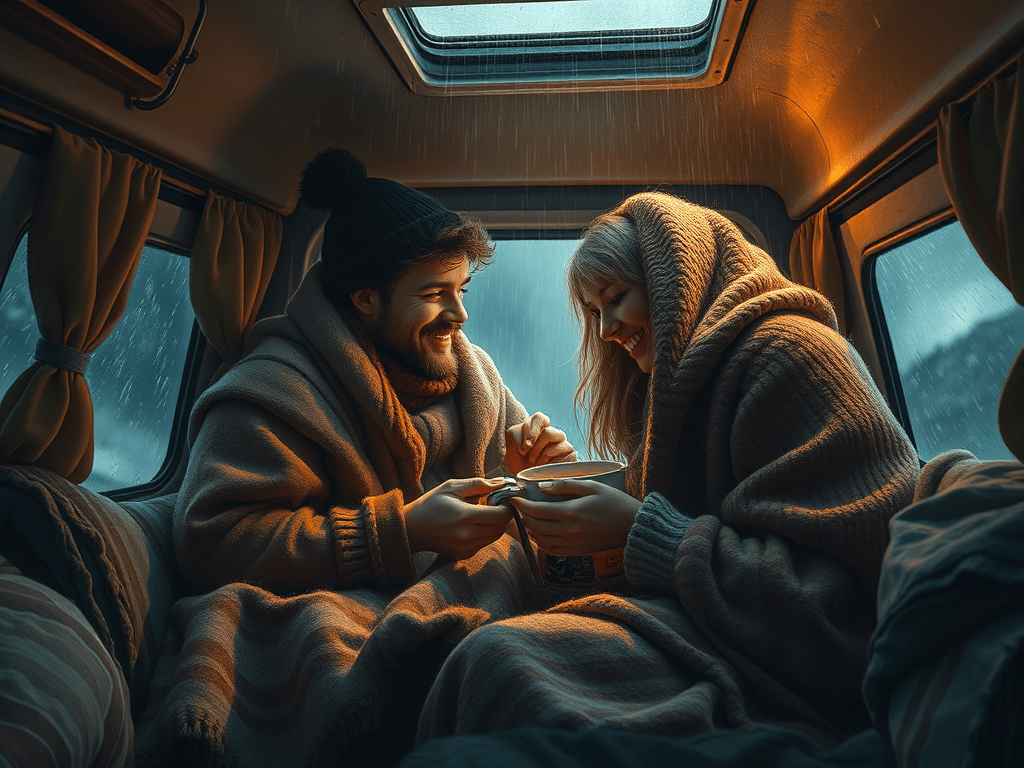 And weathering, in the campervan context, is both literal and emotional. It’s the art of being together when things get loud, unpredictable, or slightly damp. It’s sharing a blanket and a nervous laugh while the van rocks gently like a cradle of chaos. It’s making soup with one hand while holding the skylight shut with the other.