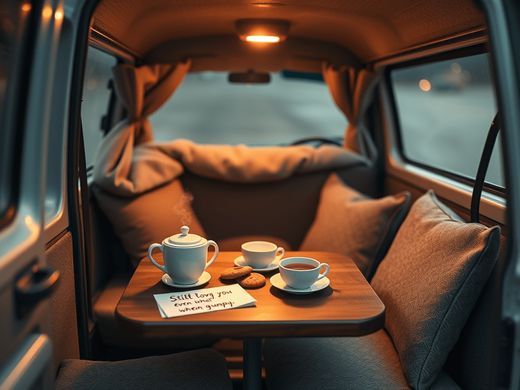 Include tea bags, a snack, a soft note, and a sticker that says, “Still love you, even when grumpy.”